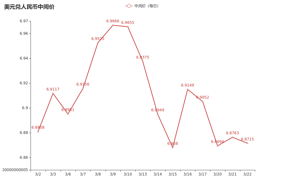 3月22日,人民币中间价上调48个基点。美元兑人民币中间价报6.8715元,上一交易日中间价报6.8763元,官方收盘价报6.8738元,夜盘收盘价报6.8802元。