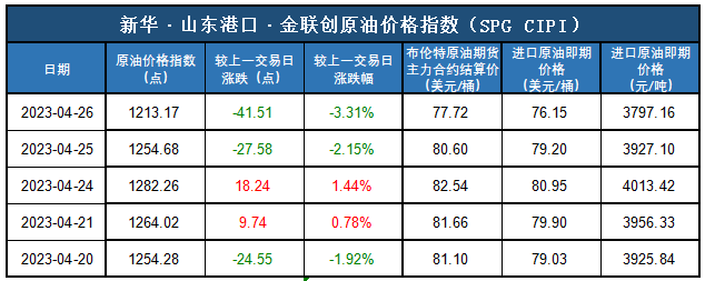 新华财经北京4月27日电(杨猛) 新华指数工业原材料研究中心数据显示,截至2023年4月26日,新华·山东港口·金联创原油价格指数(SPG CIPI)报1213.17点,较前一交易日下跌41.51点,跌幅3.31%;进口原油即期价格为76.15美元/桶,合人民币3797.16元/吨。山东港口进口原油综合到岸贴水估价为-0.20美元/桶,较前一交易日持平。