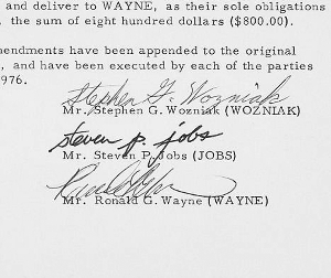 威恩以800美元卖掉苹果公司10%股份的补充合同,上面有3位苹果创始人的签名
