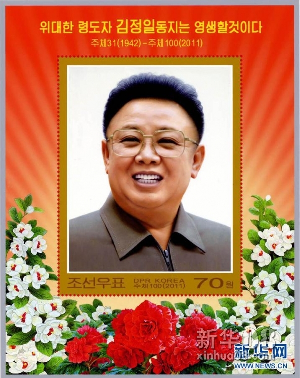 新华08网专电 朝鲜递信部、即国家邮政局发行印有已故最高领导人金正日肖像的新邮票。