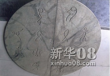 现已发现的文王后天八卦实物其材料是蛇纹石玉,呈灰黑—墨黑,深色是因为玉石中有磁铁矿包裸体。该八卦实物是二个半园弧构成,拼起来之后,其直径为125cm,中间大极阴阳鱼直径为50cm,厚度2~2.5cm,正面的八卦图的每个卦位下面有三个浮雕古文字(共24个),这在古代文献和现今流行八卦图中都是从来未曾见到过的,字体大小为4×6~5×7cm不等,反面有12个古文字,为阴刻线条的象形字(图4,图5)。