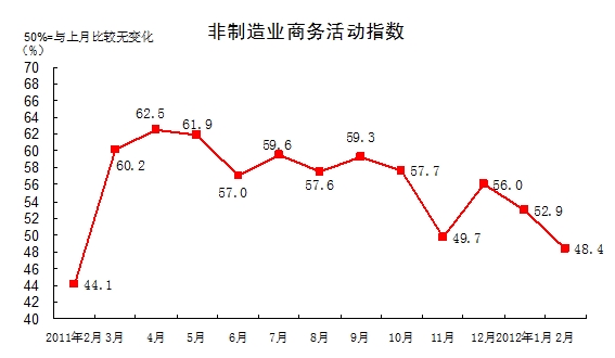 2012年2月,中国非制造业商务活动指数为48.4%,比上月下降4.5个百分点。
