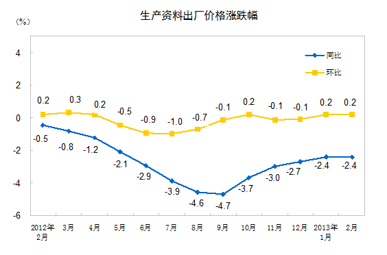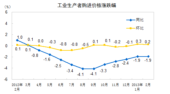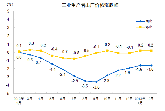 核心提示:2013年2月份,全国工业生产者出厂价格同比下降1.6%,环比上涨0.2%。工业生产者购进价格同比下降1.9%,环比上涨0.2%。