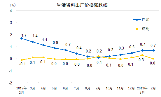2013年2月份,全国工业生产者出厂价格同比下降1.6%,环比上涨0.2%。工业生产者购进价格同比下降1.9%,环比上涨0.2%。1—2月平均,工业生产者出厂价格同比下降1.6%,工业生产者购进价格同比下降1.9%。