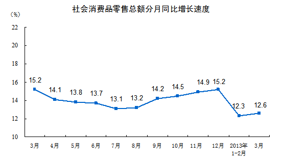 2013年3月份,社会消费品零售总额17641亿元,同比名义增长12.6%(扣除价格因素实际增长11.7%,以下除特殊说明外均为名义增长)。其中,限额以上企业(单位)消费品零售额9076亿元,增长10.5%。