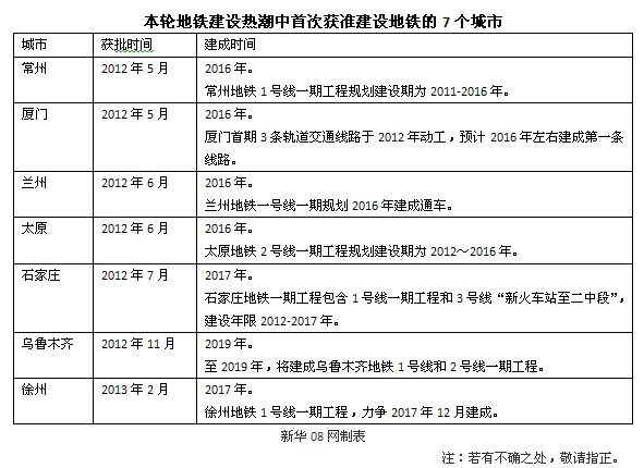核心提示:常州、厦门、兰州、太原、石家庄、乌鲁木齐、徐州等7个城市是在本轮地铁建设热潮中首次获准建设的城市。本网对这7个城市的地铁规划和最新进展进行了整理汇总,让我们先一步见证这7个准“地铁城市”的梦想起飞……