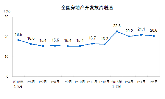 核心提示:2013年1-5月份,全国房地产开发投资26798亿元,同比名义增长20.6%,增速比1-4月份回落0.5个百分点。其中,住宅投资18363亿元,增长21.6%,增速提高0.3个百分点,占房地产开发投资的比重为68.5%。