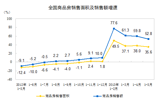1-5月份,商品房销售面积39118万平方米,同比增长35.6%,增速比1-4月份回落2.4个百分点;其中,住宅销售面积增长37.6%,办公楼销售面积增长35.5%,商业营业用房销售面积增长11.8%。商品房销售额25864亿元,增长52.8%,增速比1-4月份回落7个百分点;其中,住宅销售额增长56.8%,办公楼销售额增长53.7%,商业营业用房销售额增长22.4%。