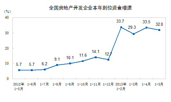 1-5月份,房地产开发企业到位资金45115亿元,同比增长32.0%,增速比1-4月份回落1.5个百分点。其中,国内贷款8051亿元,增长27.9%;利用外资199亿元,增长18.2%;自筹资金16588亿元,增长14.3%;其他资金20277亿元,增长53.7%。在其他资金中,定金及预收款12514亿元,增长57.9%;个人按揭贷款5404亿元,增长61.7%。