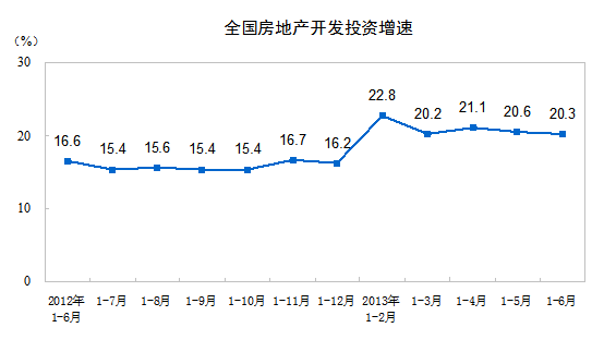 2013年1-6月份,全国房地产开发投资36828亿元,同比名义增长20.3%(扣除价格因素实际增长20.3%),增速比1-5月份回落0.3个百分点。其中,住宅投资25227亿元,增长20.8%,增速回落0.8个百分点,占房地产开发投资的比重为68.5%。