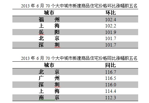 房价涨幅方面,福州、北京两地各自摘得新房价格环比、同比涨幅榜的冠军。具体来看,6月新房价格环比涨幅最大的5个城市分别是:福州(2.4%)、上海(2.2%)、岳阳(1.9%)、北京(1.7%)、深圳(1.7%),一线城市占据三席;同比涨幅最大的5个城市分别是:北京(16.7%)、广州(16.5%)、深圳(16%)、上海(14.4%)、南京(12.3%),涨幅均超10%,且一线城市北上广深悉数包揽前4名。