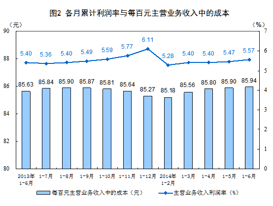 1-6月份,规模以上工业企业主营业务收入利润率为5.57%,每百元主营业务收入中的成本为85.94元,每百元资产实现的主营业务收入为121.5元,产成品存货周转天数为13.8天。