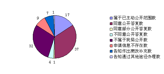 对所有收到的申请我局均按有关规定进行了认真处理,截止报告日期全部按时答复,办结率100%。其中属于已主动公开范围数17件,同意公开答复数37件,同意部分公开答复数1件,不同意公开答复数4件,不属于我局公开数32件,申请信息不存在数9件,告知作出更改补充数7件,告知通过其他途径办理数1件。