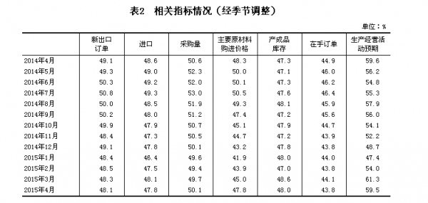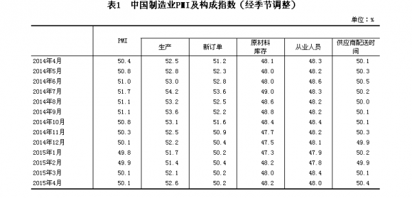 2015年4月,中国制造业采购经理指数(PMI)为50.1%,与上月持平,连续两个月高于临界点。