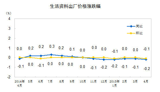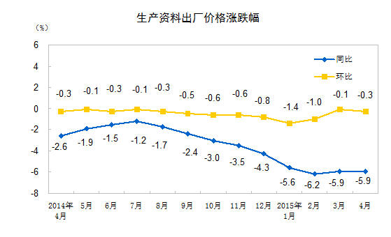 2015年4月份,全国工业生产者出厂价格环比下降0.3%,同比下降4.6%。工业生产者购进价格环比下降0.2%,同比下降5.5%。1-4月平均,工业生产者出厂价格同比下降4.6%,工业生产者购进价格同比下降5.6%。