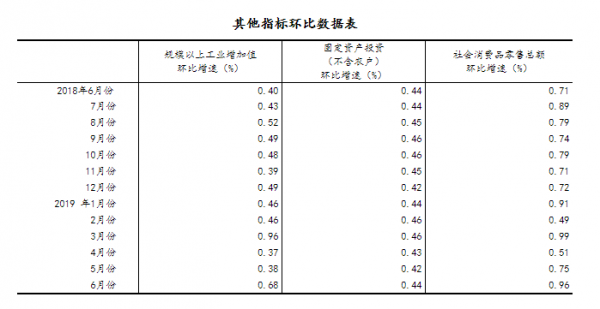 (2)根据季节调整模型自动修正结果,对近一年来各期国内生产总值、规模以上工业增加值、固定资产投资(不含农户)、社会消费品零售总额环比增速进行修订。修订结果及2019年二季度GDP环比数据、2019年6月份其他指标环比数据如下: