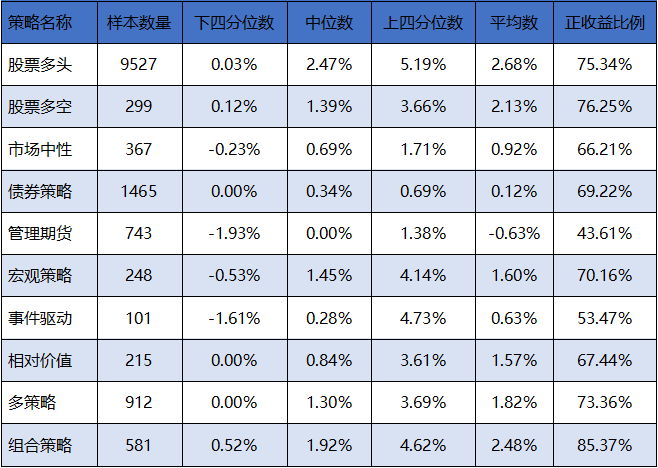 关于各策略基金的收益分布情况,我们选取满足以下四个条件的基金产品,作为有效基金样本来观察各策略累计收益的分位数水平。选取有效样本的条件:(1) 成立半年以上:即基金在2019年5月1号以前有净值数据;(2) 当月有净值披露:基金在2020年4月份有净值披露;(3) 非结构化基金;(4) 非单账户。