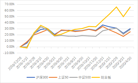 随着海外疫情进入平台期以及国内逆周期政策的积极影响,4月份A股市场主要指数出现不同程度的反弹。其中,创业板指月内涨幅最大,为10.55%;中小板指和深成指的涨幅也均超过了7%。上证综指涨3.99%,沪深300上涨6.14%,中证500上涨6.20%。