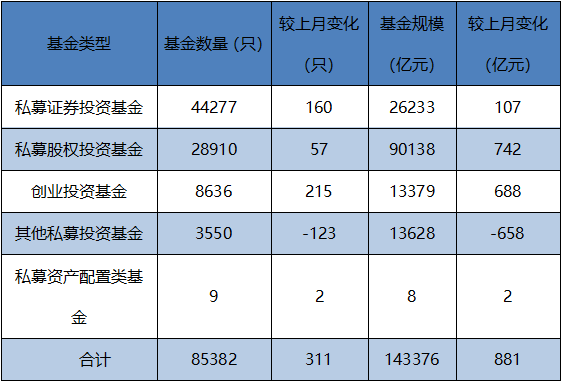 创业投资基金8636只,基金规模1.34万亿元,较3月增加687.81亿元、环比增长5.42%;其他私募投资基金3550只,基金规模1.36万亿元,较3月相比则减少657.92亿元、环比下降4.61%;私募资产配置基金9只,基金规模8.38亿元,较3月增加1.85亿元、环比增长28.42%。