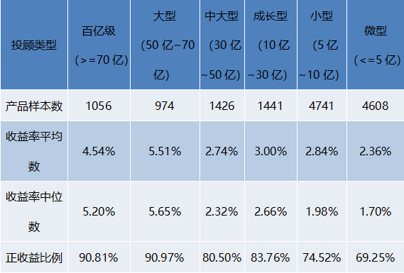 从收益表现来看,截至2020年4月底,各个规模的投顾管理人收益表现均呈现正值。其中大型(50亿~70亿)私募管理人相对其他规模表现最好,微型(<=5亿)私募管理人的累计收益率相对欠佳但也取得了正收益。从正收益比例来看,大型私募管理人的正收益比例最大,达到90.97%。