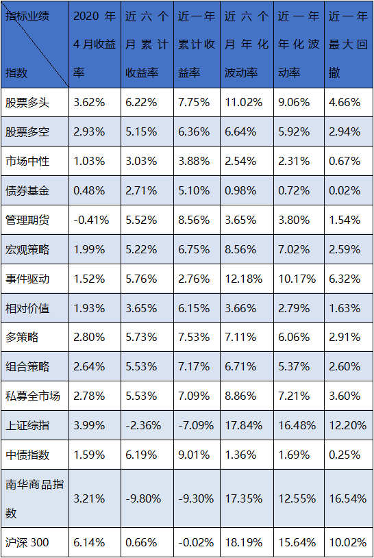 截至2020年4月底,私募全市场业绩指数本月录得正收益,为2.78%,私募FOF策略指数本月收益为2.72%。