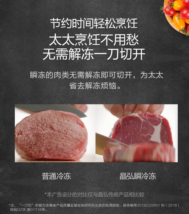 (图为用晶弘冰箱的-5℃瞬冷冻技术保鲜的肉类)