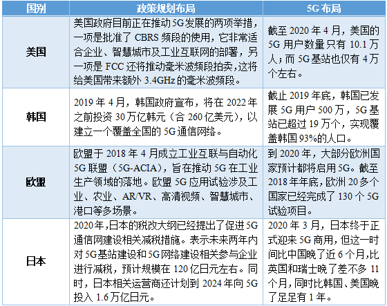 随着5G技术在各行各业中应用渗透的加深,各国逐步认识到5G投资建设能给社会发展带来的巨大效益,近年来,美国、韩国、日本等国均发布5G相关利好政策并进一步加快5G技术研发及5G基础设施投资建设的步伐。2020年,全球5G正式迎来规模商用,截至6月,全球5G商用网络已达92个,覆盖全球GDP超过72%的国家和地区。