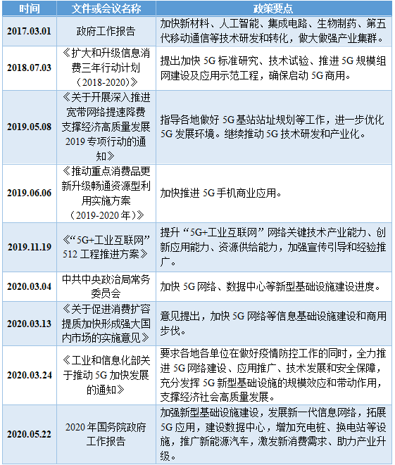 2017年政府工作报告中第一次提到了“第五代移动通信技术”,随后的2019年,“5G”应用发展提速,政策支持“5G+互联网”、5G手机等应用的发展。进入2020年后,新基建投资政策的带动下,多项政策文件提及5G产业,为5G产业发展营造良好的政策环境。