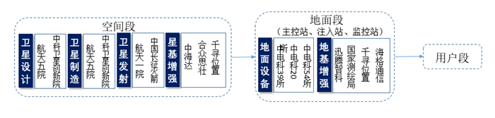 空间段由航天科技集团下属单位主抓,地面段的研制生产以中电科集团等为主导,用户段的产品及系统市场化特征较为明显,参与主体多,包括军工集团下属公司、地方国企参军公司及较多民参军企业。