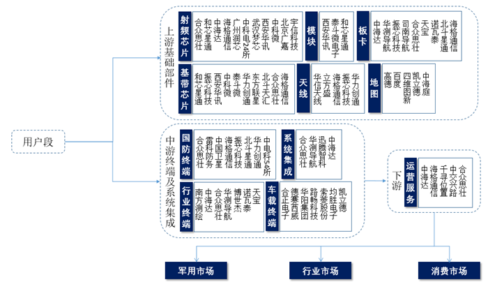 导航用户段上游基础部件是产业自主可控的关键环节,主要由基带芯片、射频芯片、板卡、天线、电子地图等构成;中游主要包括终端集成和系统集成,是产业发展的重点;下游运维服务提供众多行业应用。