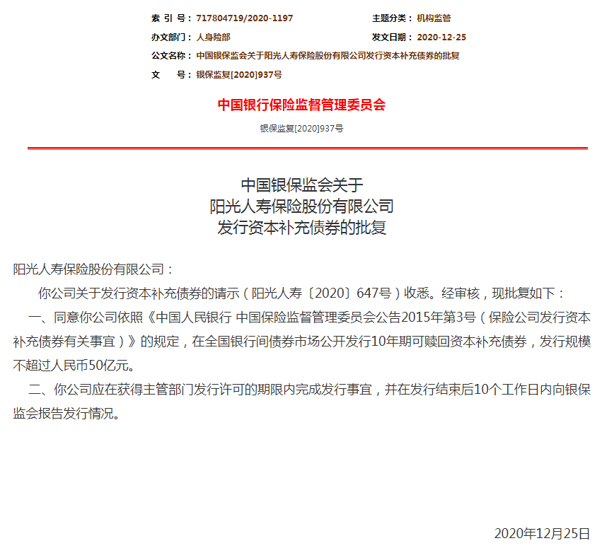 新华财经北京12月30日电 30日,中国银保监会网站披露了《中国银保监会关于阳光人寿保险股份有限公司发行资本补充债券的批复》。中国银保监会已收悉阳光人寿保险股份有限公司关于发行资本补充债券的请示(阳光人寿〔2020〕647号)收悉。,经审核,批复阳光人寿保险股份有限公司依照《中国人民银行 中国保险监督管理委员会公告2015年第3号(保险公司发行资本补充债券有关事宜)》的规定,在全国银行间债券市场公开发行10年期可赎回资本补充债券,发行规模不超过人民币50亿元。阳光人寿保险股份有限公司应在获得主管部门发行许可的期限内完成发行事宜,并在发行结束后10个工作日内向银保监会报告发行情况。