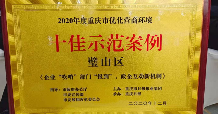 据了解,为大力宣传市委、市政府全面优化营商环境的决策部署,积极展示重庆市培育国际化、法治化、便利化投资生态和经营环境的工作成效,营造亲商安商扩商的良好氛围,2020年底,由市政府办公厅、市委宣传部、市发展改革委指导,重庆日报报业集团主办,重庆日报承办的优化营商环境十佳案例评选活动举行,璧山《企业“吹哨”部门“报道”,政企互动机制》获得了重庆市优化营商环境十佳示范案例。