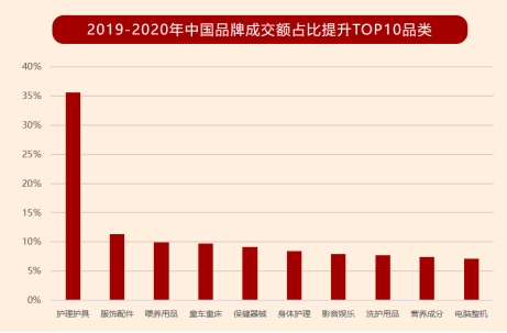 “国品”消费从民生走向健康,医疗健康领域“国品”受青睐,这是“五感”消费体验中“安全感”的一大特征。报告显示,从消费者选择中国品牌与国际品牌的品类趋势来看,2020年中国品牌成交额占比较高的品类主要集中在民生相关消费品领域,如牛奶乳品、米面粮油和禽肉蛋品等,而从占比增速角度来看,护理护具、保健器械、身体护理、营养成分等品类“国品”占比提升较多,健康消费越来越受到关注。同时在母婴领域,如喂养用品、童车童床等“国品”占比也有明显提升,展示了消费者对于中国品牌的认知和信赖与日俱增。