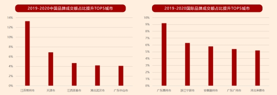 2020年中国品牌商品的消费人群产生了哪些新的变化?报告显示,从全国各省市消费者的购物偏好来看,江苏、江西、湖北等多地市的“国品”成交额占比高且持续提升,一线城市如北京和上海国际品牌占比较高,但同时这两个城市的“国品”消费也实现连续多年小幅增长。相对地,广东省多城市则是国际品牌消费较为亮眼。村镇市场与大城市“国品”消费占比均提升,充分展示出消费者对中国品牌“五感”体验的“认同感”。