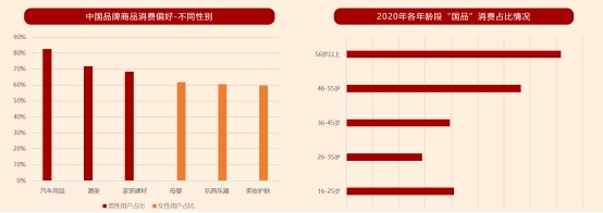国货母婴用品走入村镇家庭,服务从业者青睐国货美妆。报告显示,从2020年不同职业的“国品”消费占比来看,村镇居民、事业单位从业人员、医务工作者、服务业从业者等“国品”消费占比较高。从消费偏好来看,他们分别偏好购买的品类是母婴、家庭清洁/纸品、家装建材和美妆护肤类商品。另分性别来看,男性用户占比略高于女性,他们偏爱购买汽车用品、酒类、家装建材类的中国品牌商品;女性消费者则偏爱购买母婴、玩具乐器类中国品牌商品。可见,中国品牌丰富的品类、充分细分的商品可以全面覆盖不同地域、职业消费者的个性化需求。