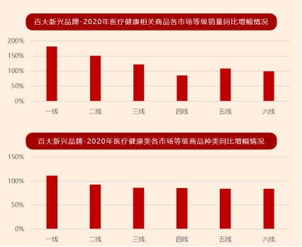 中国品牌为中国消费者量身定制的商品和服务,让消费者“五感”体验的“归属感”不断强化。报告通过对2020年增长表现亮眼的品牌进行研究,全面分析了核心新兴品牌的成长路径,旨在展现消费市场的新趋势和新变化。报告研究表明,医疗健康市场在2020年成为“百大新兴品牌”角力的新战场。从2019-2020年销售规模增速TOP100品牌的品类数据来看,医疗健康领域表现尤为亮眼,商品种类同比增幅达88%,商品销售数量同比增幅更是高达136%。从2019-2020年销售规模增速TOP100品牌的各级市场数据来看,一二线市场用户更加关注健康消费,医疗健康类商品的销量占比高,且销量持续大幅增长。
