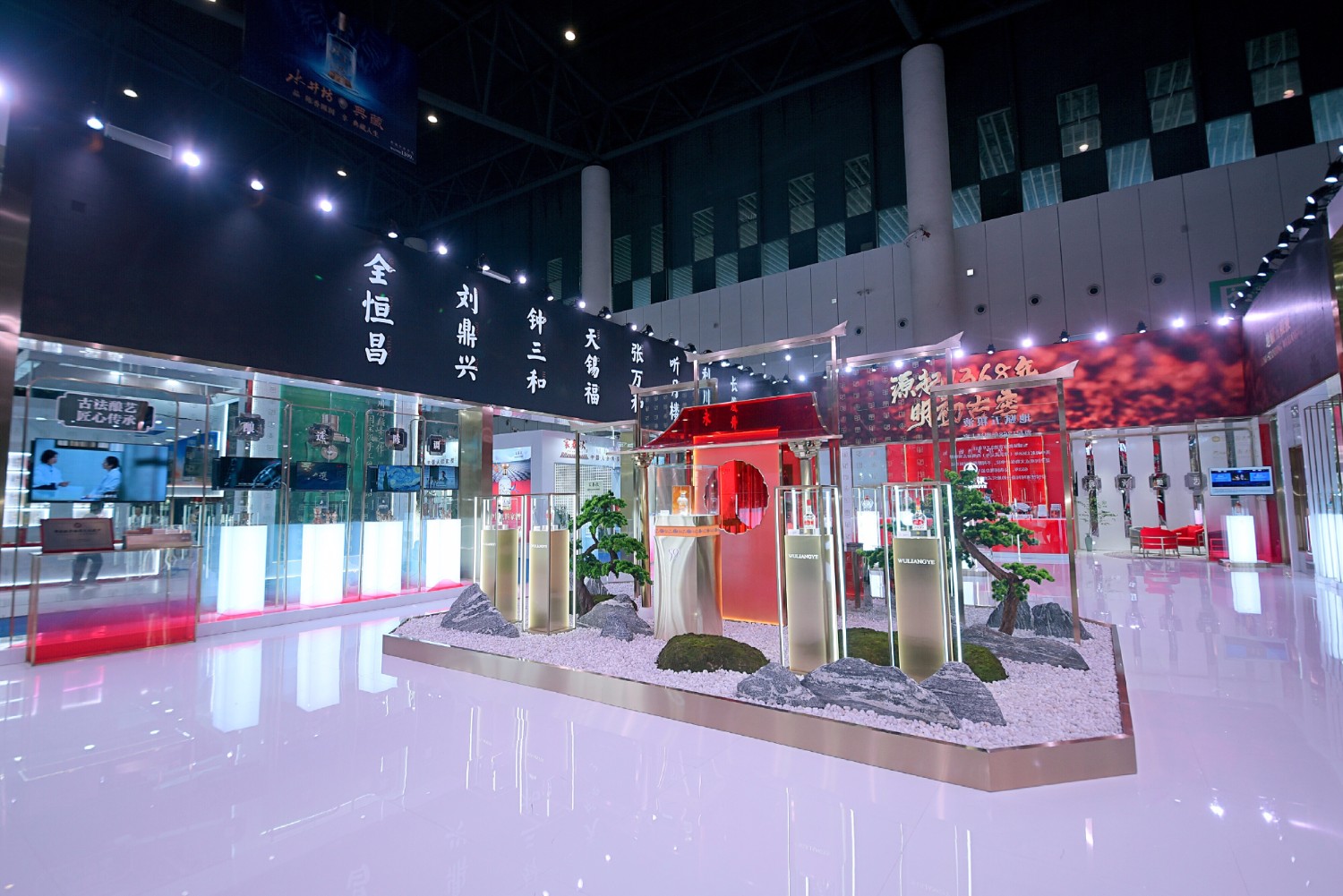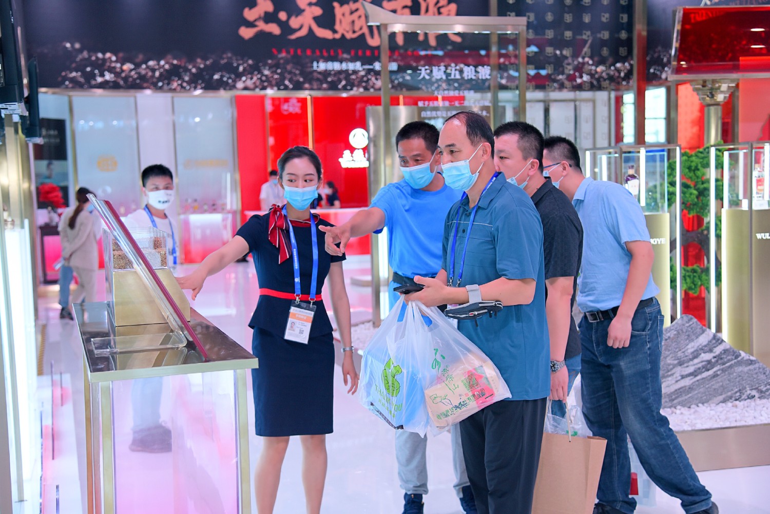 在博览会展馆,位于16号食品饮料产业馆的五粮液展厅人头攒动、备受关注。全新升级的展厅外观通透明亮,香槟金搭配中国红的主色调彰显着世界一流品牌的全新面貌,屏风、松柏、牌匾等中国传统元素衬托出五粮美酒的千年传承。展厅通过270度环绕大屏、3D视频、仿真模型、造景还原、精美图片墙等形式,全面展示了被列为国家级非物质文化遗产的五粮液酒传统酿造技艺,五粮液独特的自然环境优势、八大明清古窖池群优势、五粮液企业发展进程和品牌荣誉,充分彰显出中国白酒龙头企业形象和世界名酒品牌魅力。