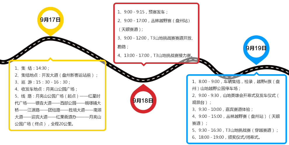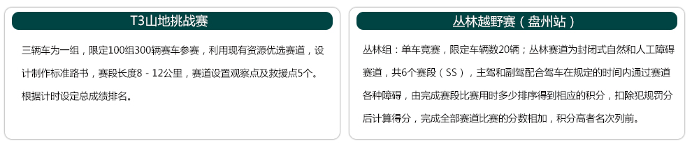 由六盘水市人民政府、贵州省体育局、贵州省文化和旅游厅共同主办的2020越野e族山地英雄会T3山地挑战赛、丛林越野赛,将于9月17日至19日在贵州盘州市将军谷运动公园(即越野e族4×4 park)举行。[详细]