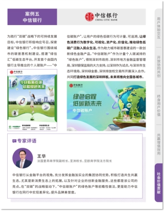 在社会价值贡献方面,为践行“双碳”目标下的可持续发展目标,中信银行积极响应号召,以“绿色银行”理念为指引,围绕城市的碳普惠机制建设,搭建“绿·信·汇”低碳生态平台,开发首个由国内银行主导推出的个人碳账户——“中信碳账户”,让用户的绿色低碳行为可计量、可追溯,让绿色消费行为数字化、可视化、资产化、价值化,推动绿色低碳广泛融入民众生活。“中信碳账户”作为计量个人碳减排的“绿色账户”,得到深圳市政府、深圳市金融局、深圳市银保监局的大力支持,以深圳作为试点,与深圳生态环境局、深圳绿金委、深圳排放权交易所开展深入合作,共同打造绿色发展的深圳样板,未来将推向全国各城市。