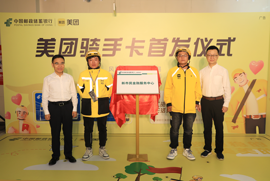 为认真落实中国银保监会、中国人民银行《关于加强新市民金融服务工作的通知》的要求,提升快递员、外卖骑手等新市民群体基础金融服务的便利性和可得性,为新市民朋友们搭建一个更广阔、更温暖、更贴心的服务平台,9月23日,中国邮政储蓄银行(以下简称“邮储银行”)联合美团在京举行首发仪式,推出“邮储美团新市民主题骑手借记卡”。同时,邮储银行北京分行首家“新市民服务中心”揭牌亮相,为室外工作者提供临时休息场地和便民惠民服务,助力新市民更好融入新生活。邮储银行副行长徐学明,美团副总裁包塔出席活动。