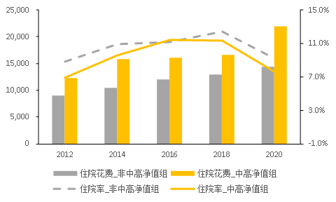 白皮书显示,中高净值人群的住院率和患病就诊率均低于非中高净值人群,医疗资源使用频率偏低。与之相对,中高净值人群的住院费用及年度家庭医疗总开支却明显更高,这意味着其在使用医疗服务资源时追求更高层次的服务需求。