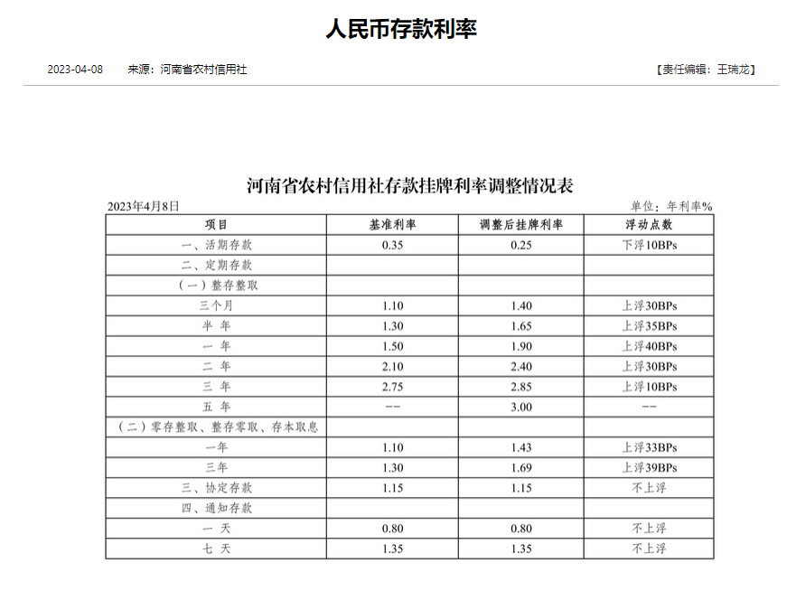 根据河南省农村信用社网站公告,自4月8日起,一年期、两年期、三年期整存整取定期存款挂牌利率分别调整至1.9%、2.4%、2.85%。