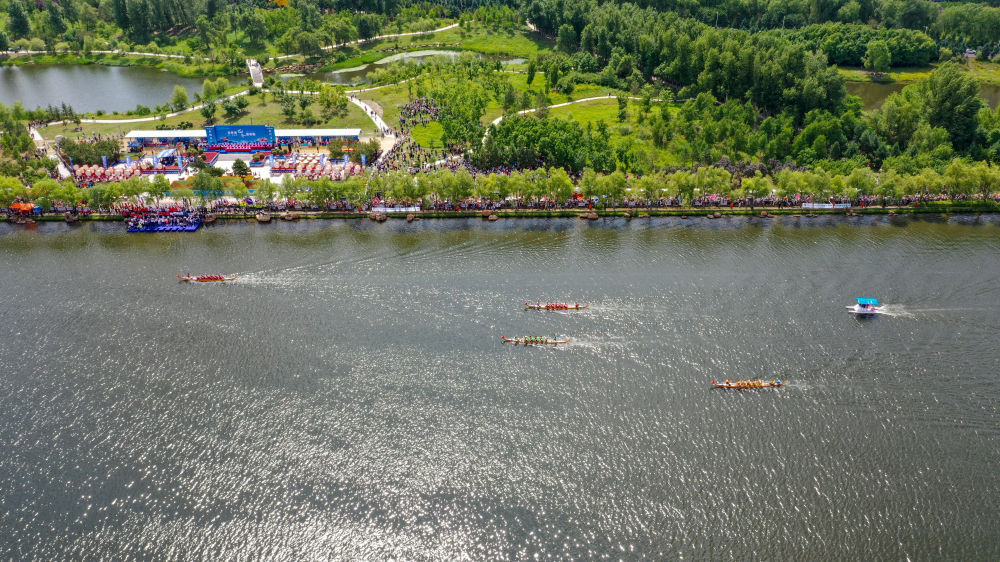 6月22日,在吉林省长春市伊通河工业轨迹公园,众多市民前来观看龙舟比赛(无人机拍摄)。 新华社记者 张楠摄
