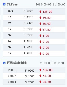 6月6日午间消息,今日上海银行间同业拆放利率(Shibor)大幅攀升,隔夜拆放利率大涨135.9个基点至5.98%;1周拆放利率升39.80基点至5.13%,2周拆放利率升36.90基点至5.24% 1月拆放利率升57.80基点至5.09%,即月内拆借利率都升至5%以上,3月、半年等利率走势较为稳定。