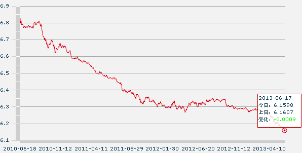 2013年6月19日,人民币对美元汇率中间价报6.1677,人民币对美元在重启汇改三年来已累计升值10.70%。