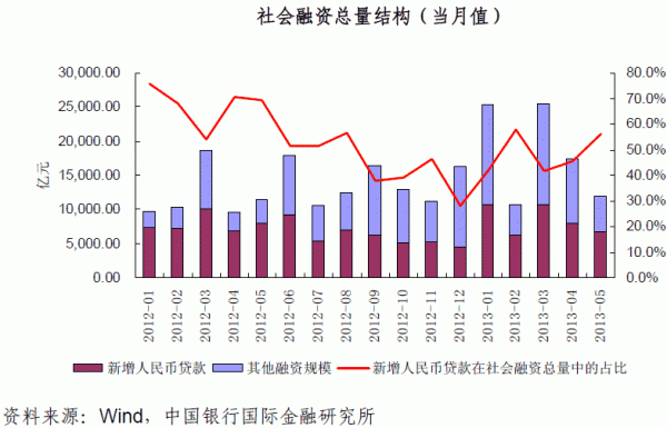 报告还指出 ,人民币贷款占社会融资总量的比重重新上升。相比3月份人民币贷款在社会融资总量的占比仅为41.7%,4月份和5月份的这一比重均出现了上涨,其中5月份这一比重达到了56.1%,重新回到了去年年中的水平。