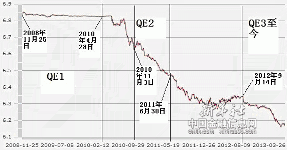 根据中国金融信息网人民币频道计算,在美联储推出量化宽松的五年间,人民币兑美元汇率中间价累计升值10.76%(截至2013年7月10日)。