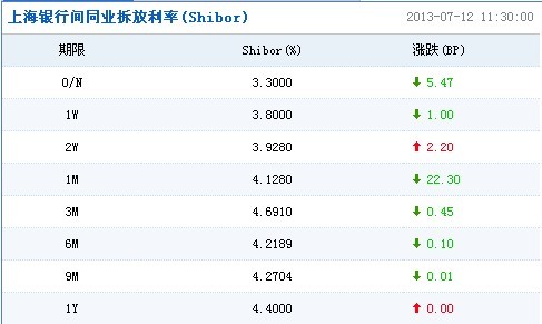 北京(CNFIN.COM/XINHUA08.COM)--12日上海银行间同业拆放利率(Shibor)显示,短期利率涨跌互现,隔夜利率下跌5.47个基点,至3.3000%,14天利率上涨2.20个基点,至3.9280%。