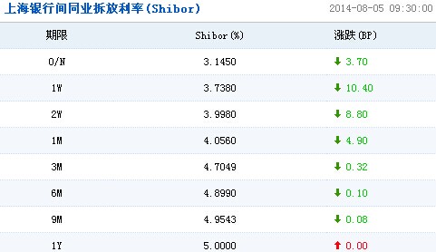 上海银行间同业拆放利率(Shibor)显示,隔夜Shibor报3.1450%,下跌3.70个基点;7天Shibor报3.7380%,下跌10.40个基点;1个月Shibor报4.0560%,下跌4.9个基点;3个月Shibor报4.7049%,下跌0.32个基点。