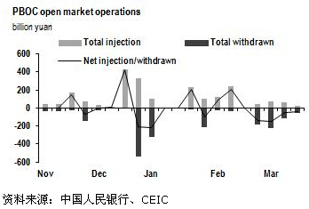 第三,中国人民银行在春节过后通过公开市场操作注入的流动性减少,但看起来有意引导市场利率下行。中国人民银行于3月17日将7日回购定盘利率再次下调10个基点,降至4.65%,上次下调该种定盘利率是在3月3日,此前中国人民银行在3月1日还将基准利率下调了25个基点。此次下调回购定盘利率预示着央行倾向于货币宽松并愿意引导货币市场利率下行。实际上,在中国人民银行自2014年11月引入货币宽松措施(包括两次降息和一次降准后),银行间利率已经攀升。从公开市场操作的额度来看,中国人民银行在2月13日前的四周向市场注入了4000亿元;而从2月27日一周到上周撤出的净流动性达3800亿元,几乎抵消了春节前注入的所有流动性(图6)。因此,我们预计中国人民银行将会通过降准方式注入永久流动性,与引导市场利率下行的目标保持一致。自上次于3月1日下调基准利率以来,7日回购利率已从3月2日的4.82%下降至目前的4.41%。